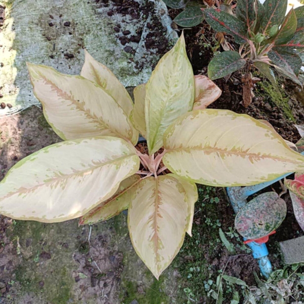 Выраженный розовый хребет, округлый в своей широкой части лист, рисунок мало заметен, самый светлый тон