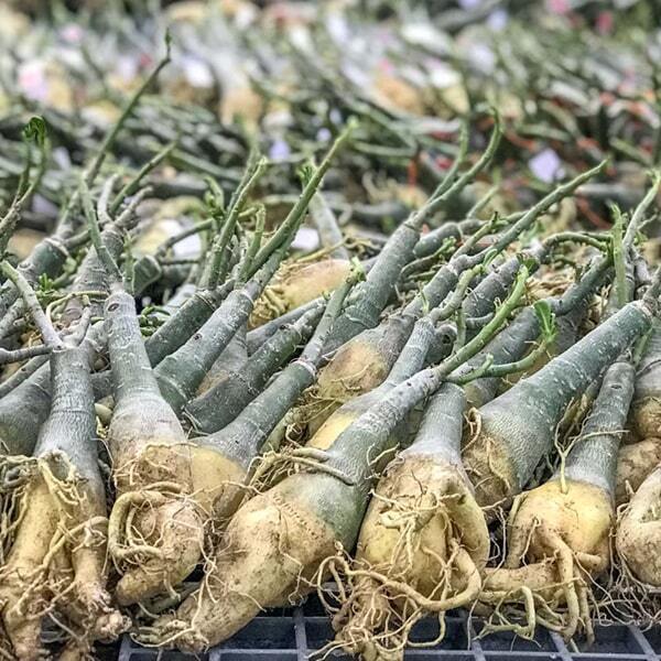 Привитый адениум обесум. Возраст подвоя 1-1.5 года. Растение в состоянии вегетативного покоя с открытой корневой системой – без земляного кома и горшочка, без листьев и цветков. Диаметр каудекса – 5-7 см, высота растений 20-25 см, вес – 180-250 г. Минимальное количество рожек – 2. Длина рожек 2-6 см.