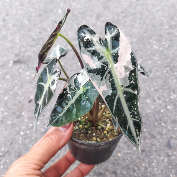При получении обработайте свое растение (по желанию) фунгицидом – можно, например, добавить в грунт фитоспорин и пересадите в горшок с легким слабо-кислым субстратом (pH 5,5-6,5). Алоказии подойдет любой универсальный грунт для ароидных. Важно следить, чтобы грунт был легким. Можно разбавить универсальный грунт кокосовыми чипсами либо нейтральным торфом и перлитом. Грунт для алоказии должен быть питательным – можно добавить удобрение длительного действия например, осмокот, либо биогумус. Алоказии хорошо адаптируются в обычных домашних условиях, но оценят и тепличку, которая обеспечит им повышенную влажность для скорейшего набора корней и новых листьев. В качестве теплички можно использовать прозрачный пакет или зип-пакет.