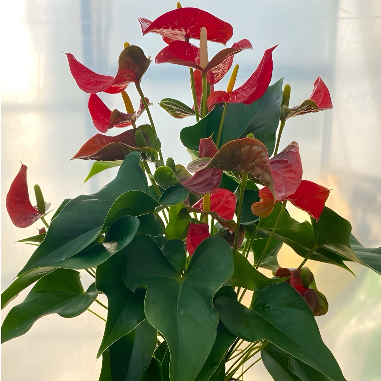 Антуриумы приезжают с небольшим торфяным комом либо с полностью открытой, хорошо развитой корневой системой, упакованными для транспортировки в пакет без горшка. Куст состоит, как правило, из нескольких ростов.