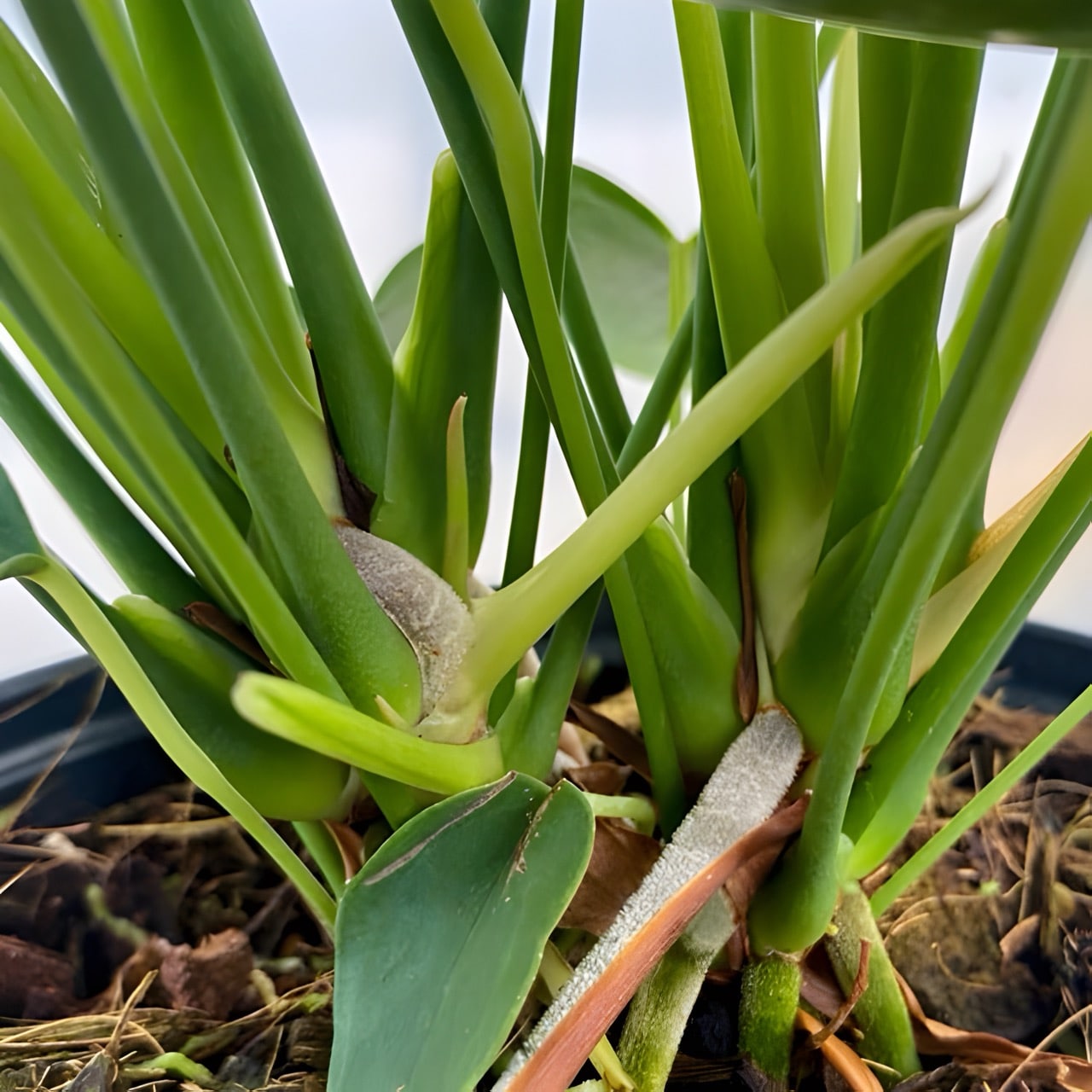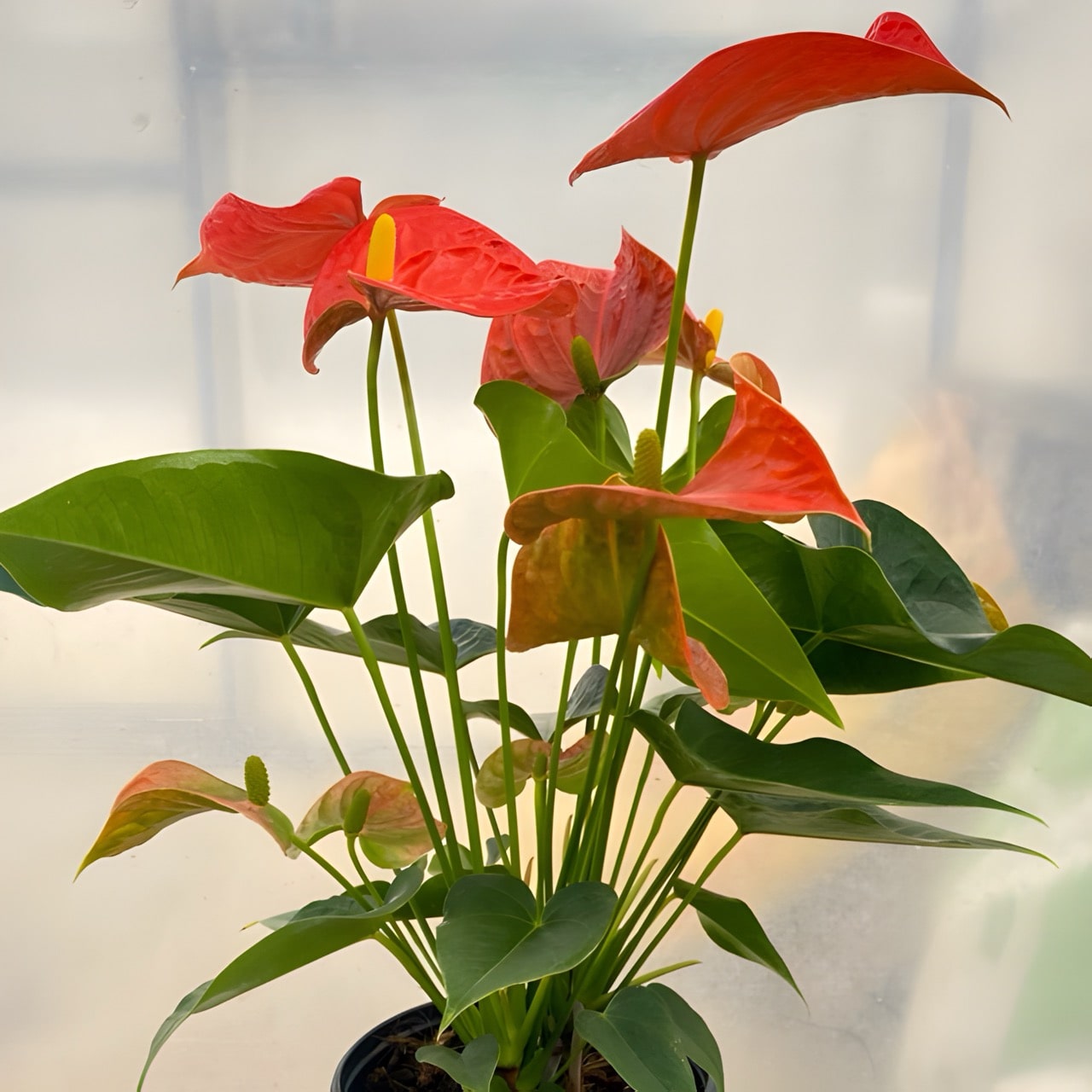 Антуриумы приезжают с небольшим торфяным комом либо с полностью открытой, хорошо развитой корневой системой, упакованными для транспортировки в пакет без горшка. Куст состоит, как правило, из нескольких ростов.