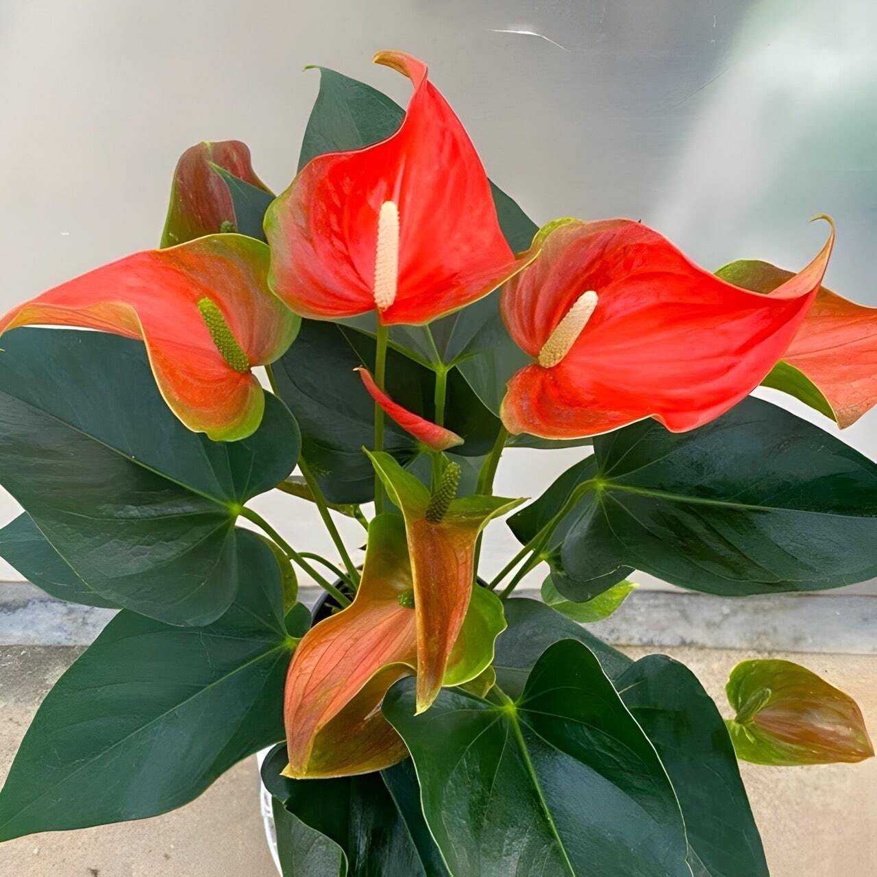 Антуриумы приезжают с небольшим торфяным комом либо с полностью открытой, хорошо развитой корневой системой, упакованными для транспортировки в пакет без горшка. Куст состоит, как правило, из нескольких ростов.