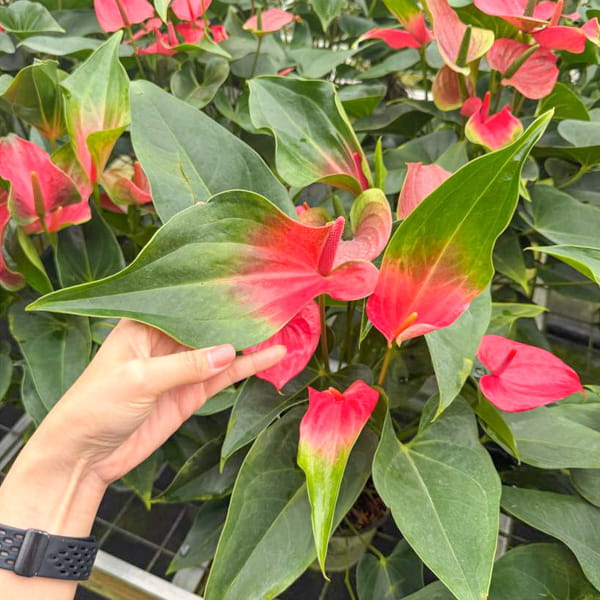 Антуриумы приезжают с небольшим торфяным комом либо с полностью открытой, хорошо развитой корневой системой, упакованными для транспортировки в пакет без горшка. Куст состоит, как правило, из нескольких ростов.