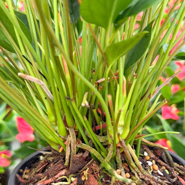 Антуриумы приезжают с небольшим торфяным комом либо с полностью открытой, хорошо развитой корневой системой, упакованными для транспортировки в пакет без горшка. Куст состоит, как правило, из нескольких ростов.