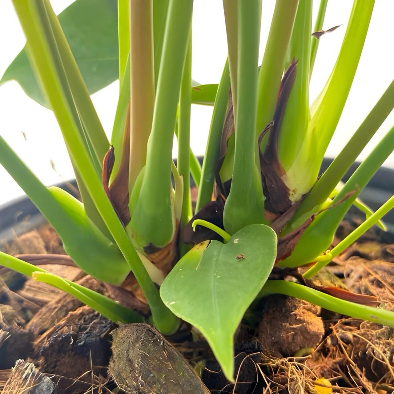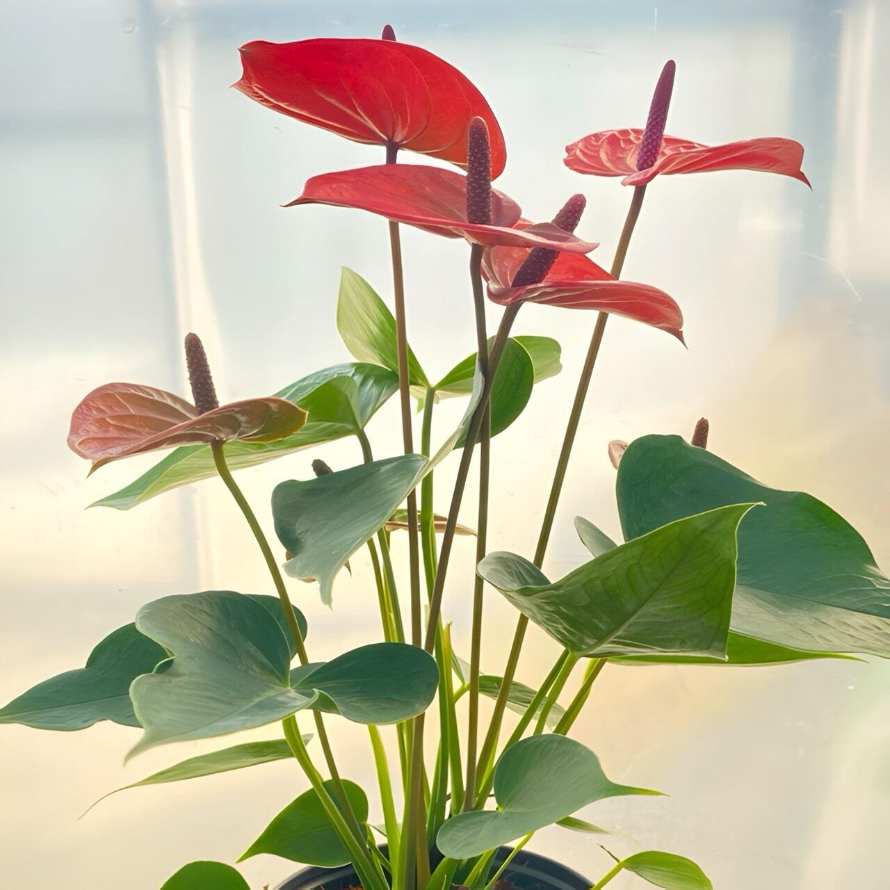 Антуриумы приезжают с небольшим торфяным комом либо с полностью открытой, хорошо развитой корневой системой, упакованными для транспортировки в пакет без горшка. Куст состоит, как правило, из нескольких ростов.