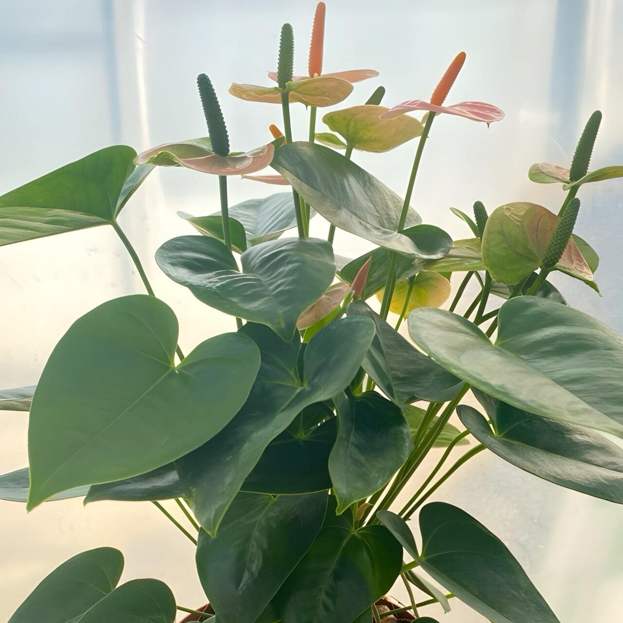 Антуриумы приезжают с небольшим торфяным комом либо с полностью открытой, хорошо развитой корневой системой, упакованными для транспортировки в пакет без горшка. Куст состоит, как правило, из нескольких ростов.