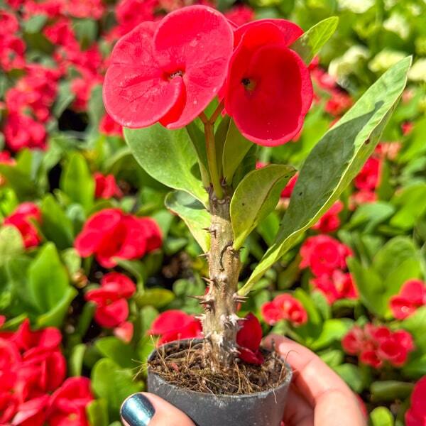 Эуфорбии милли – молодое растение корнесобственное либо прививка – в зависимости от сорта. Высота растения – минимум 6 см, в среднем 8-12 см. Эуфорбии милли поставляются с закрытой корневой системой в транспортировочном горшочке 2 дюйма с кокосовым торфом. Растения, как правило, поступают без листьев, цветков и бутонов. На стаканчике имеется маркировка с указанием номера сорта или непосредственно сорта.