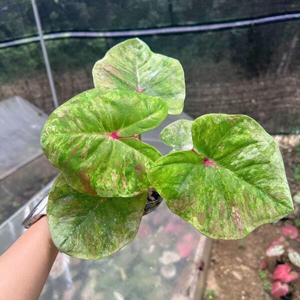 Молодые листья имеют окраску, отличную от сортовой. Сортовую окраску каладиум приобретает по мере взросления. Несоответствие окраса ювенильных листьев ожидаемой расцветке не говорит о пересорте – пожалуйста, дождитесь активного роста растения.