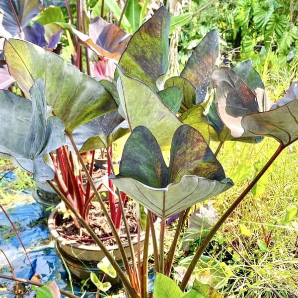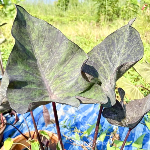 Укорененное молодое растение с закрытой корневой системой в транспортировочном горшочке 3-4 дюйма. Листовые пластины могут быть обрезаны на высоте 10-20 см для уменьшения испарения во время транспортировки. Если листовые пластины не обрезаны, за время транспортировки они могут частично либо полностью подгнить. Отсутствие листьев не является показателем гибели растения – при получении необходимо проверить состояние ризомы и корней. Т.к. колоказии пересылаются в сильно увлажненном субстрате, нижняя часть ризом также может подгнить. Это не препятствует успешной адаптации при условии наличия молодых корней выше подгнившей части ризомы.