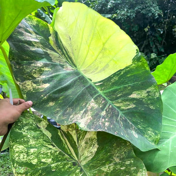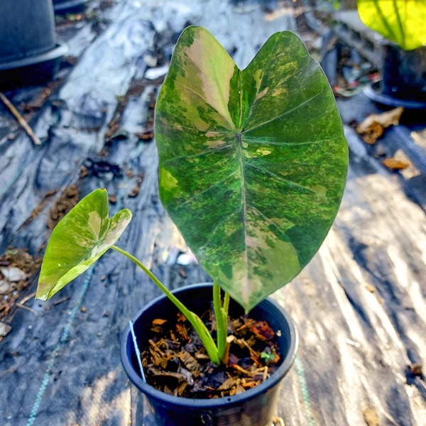 Укорененное молодое растение с закрытой корневой системой в транспортировочном горшочке 3-4 дюйма. Листовые пластины могут быть обрезаны на высоте 10-20 см для уменьшения испарения во время транспортировки. Если листовые пластины не обрезаны, за время транспортировки они могут частично либо полностью подгнить. Отсутствие листьев не является показателем гибели растения – при получении необходимо проверить состояние ризомы и корней. Т.к. колоказии пересылаются в сильно увлажненном субстрате, нижняя часть ризом также может подгнить. Это не препятствует успешной адаптации при условии наличия молодых корней выше подгнившей части ризомы.