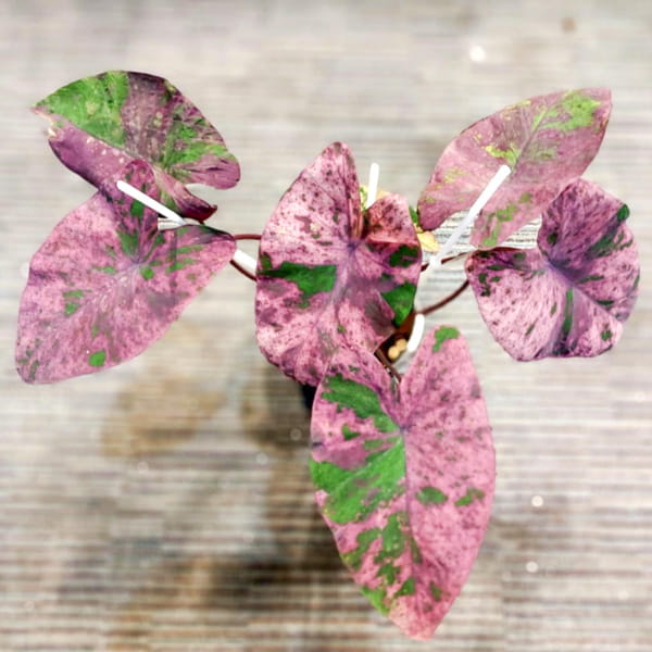 Укорененное молодое растение с закрытой корневой системой в транспортировочном горшочке 3-4 дюйма. Листовые пластины могут быть обрезаны на высоте 10-20 см для уменьшения испарения во время транспортировки. Если листовые пластины не обрезаны, за время транспортировки они могут частично либо полностью подгнить. Отсутствие листьев не является показателем гибели растения – при получении необходимо проверить состояние ризомы и корней. Т.к. колоказии пересылаются в сильно увлажненном субстрате, нижняя часть ризом также может подгнить. Это не препятствует успешной адаптации при условии наличия молодых корней выше подгнившей части ризомы.