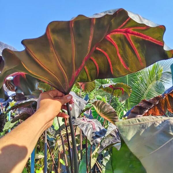 Укорененное молодое растение с закрытой корневой системой в транспортировочном горшочке 3-4 дюйма. Листовые пластины могут быть обрезаны на высоте 10-20 см для уменьшения испарения во время транспортировки. Если листовые пластины не обрезаны, за время транспортировки они могут частично либо полностью подгнить. Отсутствие листьев не является показателем гибели растения – при получении необходимо проверить состояние ризомы и корней. Т.к. колоказии пересылаются в сильно увлажненном субстрате, нижняя часть ризом также может подгнить. Это не препятствует успешной адаптации при условии наличия молодых корней выше подгнившей части ризомы.