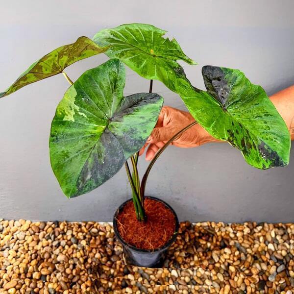 Укорененное молодое растение с закрытой корневой системой в транспортировочном горшочке 3-4 дюйма. Листовые пластины могут быть обрезаны на высоте 10-20 см для уменьшения испарения во время транспортировки. Если листовые пластины не обрезаны, за время транспортировки они могут частично либо полностью подгнить. Отсутствие листьев не является показателем гибели растения – при получении необходимо проверить состояние ризомы и корней. Т.к. колоказии пересылаются в сильно увлажненном субстрате, нижняя часть ризом также может подгнить. Это не препятствует успешной адаптации при условии наличия молодых корней выше подгнившей части ризомы.