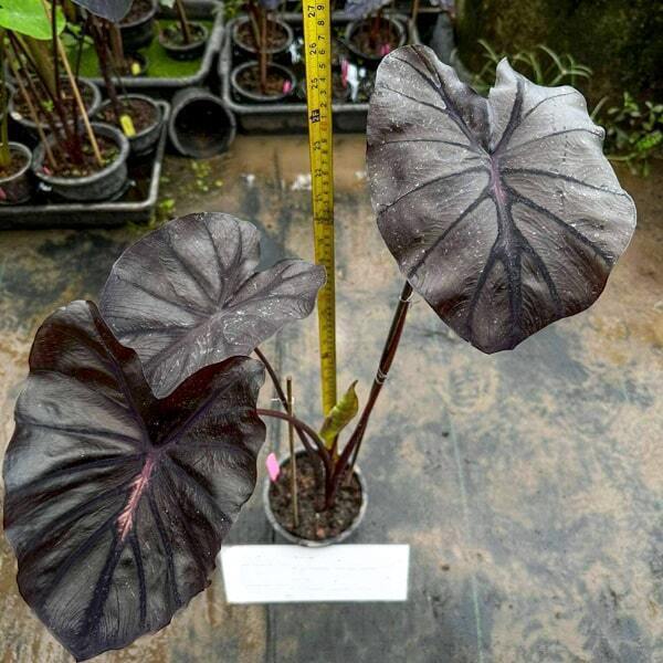 Укорененное молодое растение с закрытой корневой системой в транспортировочном горшочке 3-4 дюйма. Листовые пластины могут быть обрезаны на высоте 10-20 см для уменьшения испарения во время транспортировки. Если листовые пластины не обрезаны, за время транспортировки они могут частично либо полностью подгнить. Отсутствие листьев не является показателем гибели растения – при получении необходимо проверить состояние ризомы и корней. Т.к. колоказии пересылаются в сильно увлажненном субстрате, нижняя часть ризом также может подгнить. Это не препятствует успешной адаптации при условии наличия молодых корней выше подгнившей части ризомы.