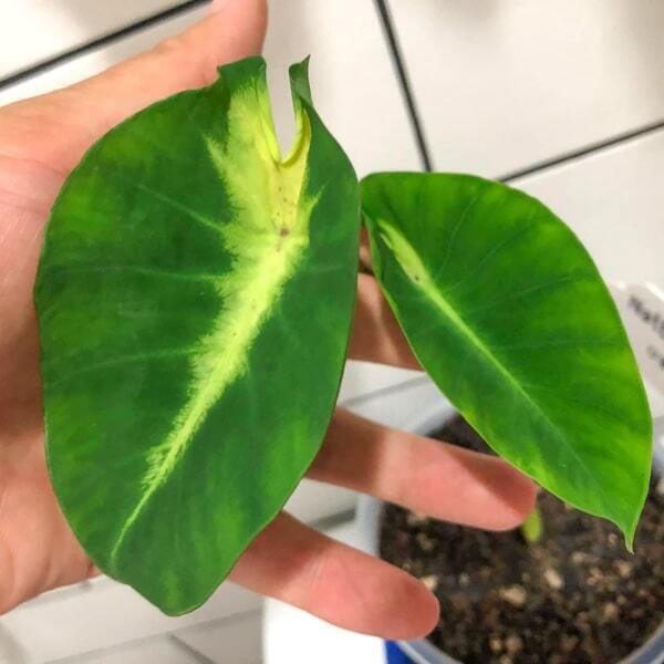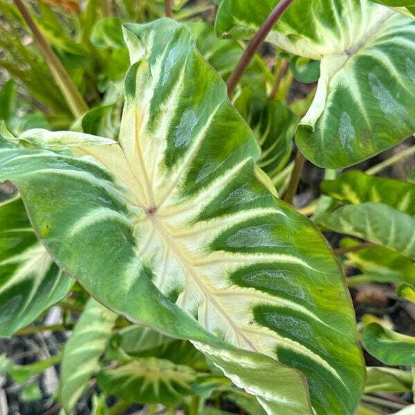 Укорененное молодое растение с закрытой корневой системой в транспортировочном горшочке 3-4 дюйма. Листовые пластины могут быть обрезаны на высоте 10-20 см для уменьшения испарения во время транспортировки. Если листовые пластины не обрезаны, за время транспортировки они могут частично либо полностью подгнить. Отсутствие листьев не является показателем гибели растения – при получении необходимо проверить состояние ризомы и корней. Т.к. колоказии пересылаются в сильно увлажненном субстрате, нижняя часть ризом также может подгнить. Это не препятствует успешной адаптации при условии наличия молодых корней выше подгнившей части ризомы.
