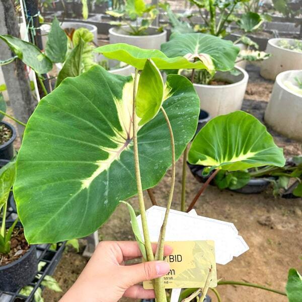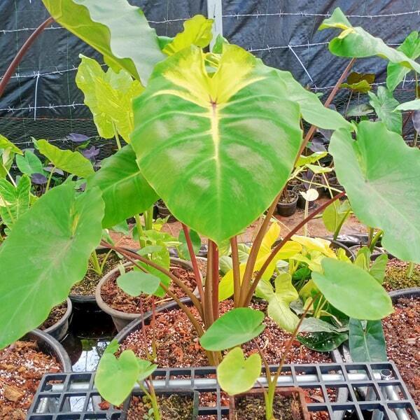 Укорененное молодое растение с закрытой корневой системой в транспортировочном горшочке 3-4 дюйма. Листовые пластины могут быть обрезаны на высоте 10-20 см для уменьшения испарения во время транспортировки. Если листовые пластины не обрезаны, за время транспортировки они могут частично либо полностью подгнить. Отсутствие листьев не является показателем гибели растения – при получении необходимо проверить состояние ризомы и корней. Т.к. колоказии пересылаются в сильно увлажненном субстрате, нижняя часть ризом также может подгнить. Это не препятствует успешной адаптации при условии наличия молодых корней выше подгнившей части ризомы.