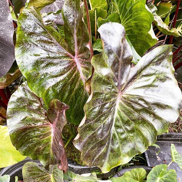 Укорененное молодое растение с закрытой корневой системой в транспортировочном горшочке 3-4 дюйма. Листовые пластины могут быть обрезаны на высоте 10-20 см для уменьшения испарения во время транспортировки. Если листовые пластины не обрезаны, за время транспортировки они могут частично либо полностью подгнить. Отсутствие листьев не является показателем гибели растения – при получении необходимо проверить состояние ризомы и корней. Т.к. колоказии пересылаются в сильно увлажненном субстрате, нижняя часть ризом также может подгнить. Это не препятствует успешной адаптации при условии наличия молодых корней выше подгнившей части ризомы.
