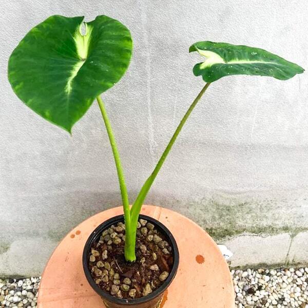Укорененное молодое растение с закрытой корневой системой в транспортировочном горшочке 3-4 дюйма. Листовые пластины могут быть обрезаны на высоте 10-20 см для уменьшения испарения во время транспортировки. Если листовые пластины не обрезаны, за время транспортировки они могут частично либо полностью подгнить. Отсутствие листьев не является показателем гибели растения – при получении необходимо проверить состояние ризомы и корней. Т.к. колоказии пересылаются в сильно увлажненном субстрате, нижняя часть ризом также может подгнить. Это не препятствует успешной адаптации при условии наличия молодых корней выше подгнившей части ризомы.