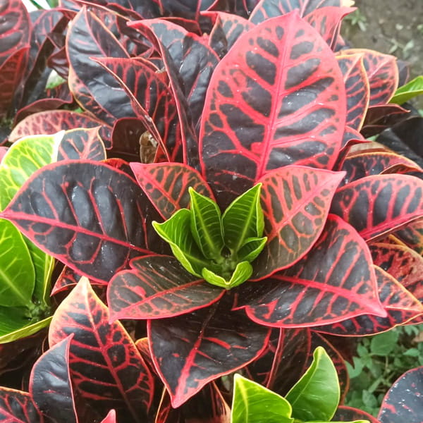 Окрас кротонов зависит от сезона. Даже яркие сорта могут приехать с зелеными листьями. По мере роста при достаточном количестве тепла и света при смене сезона они окрашиваются в сортовые цвета.