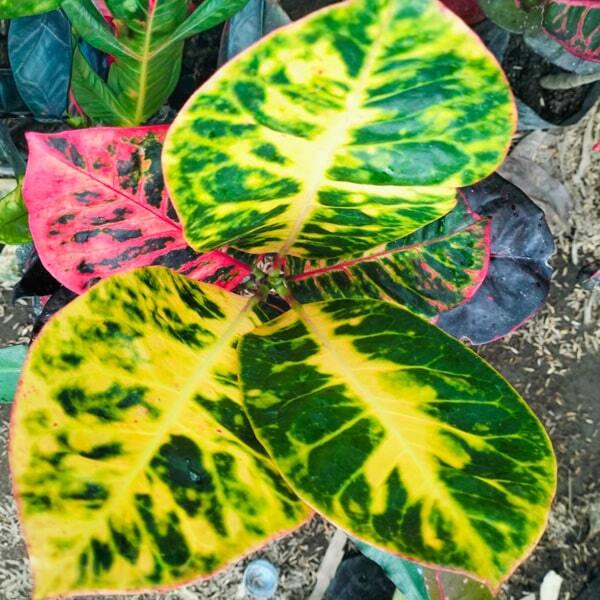 Окрас кротонов зависит от сезона. Даже яркие сорта могут приехать с зелеными листьями. По мере роста при достаточном количестве тепла и света при смене сезона они окрашиваются в сортовые цвета.