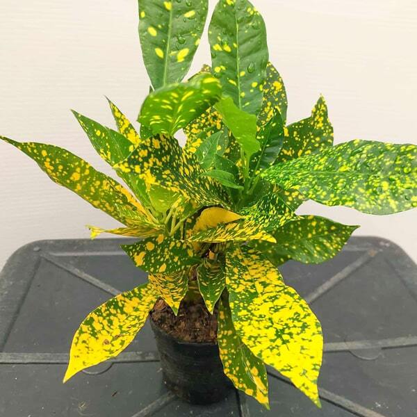 Окрас кротонов зависит от сезона. Даже яркие сорта могут приехать с зелеными листьями. По мере роста при достаточном количестве тепла и света при смене сезона они окрашиваются в сортовые цвета.