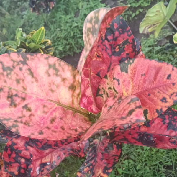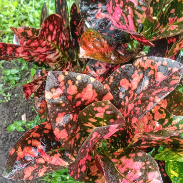 Окрас кротонов зависит от сезона. Даже яркие сорта могут приехать с зелеными листьями. По мере роста при достаточном количестве тепла и света при смене сезона они окрашиваются в сортовые цвета.