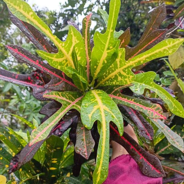 Окрас кротонов зависит от сезона. Даже яркие сорта могут приехать с зелеными листьями. По мере роста при достаточном количестве тепла и света при смене сезона они окрашиваются в сортовые цвета.