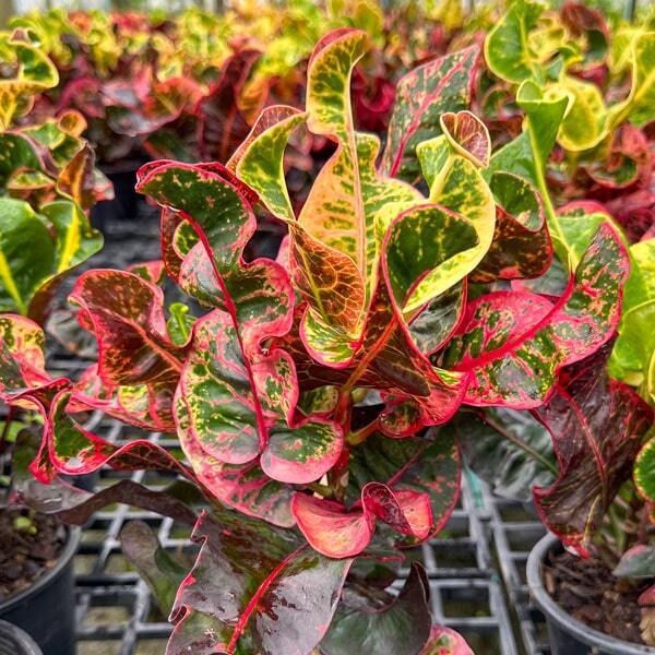 Окрас кротонов зависит от сезона. Даже яркие сорта могут приехать с зелеными листьями. По мере роста при достаточном количестве тепла и света при смене сезона они окрашиваются в сортовые цвета.