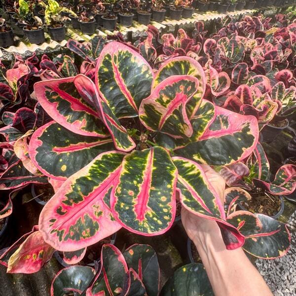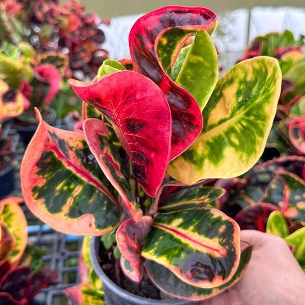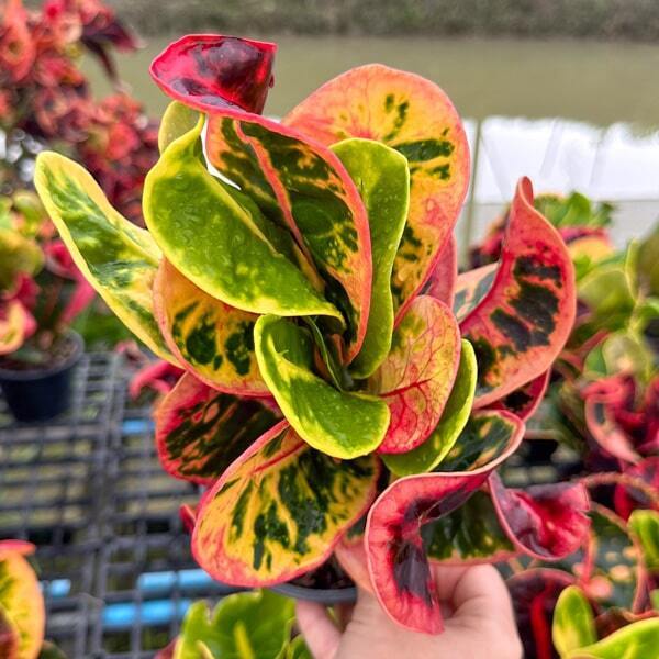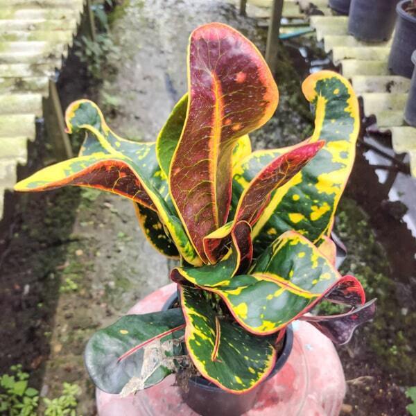 Окрас кротонов зависит от сезона. Даже яркие сорта могут приехать с зелеными листьями. По мере роста при достаточном количестве тепла и света при смене сезона они окрашиваются в сортовые цвета.