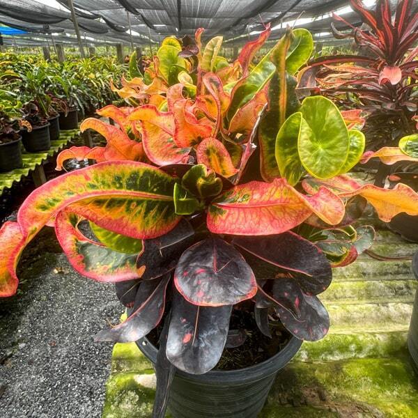 Окрас кротонов зависит от сезона. Даже яркие сорта могут приехать с зелеными листьями. По мере роста при достаточном количестве тепла и света при смене сезона они окрашиваются в сортовые цвета.