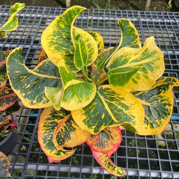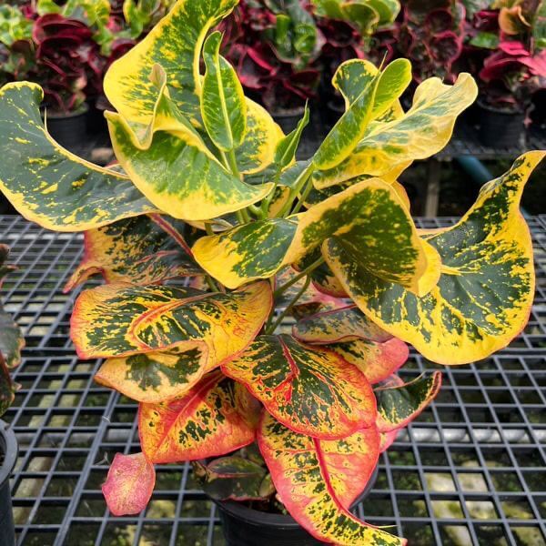 Окрас кротонов зависит от сезона. Даже яркие сорта могут приехать с зелеными листьями. По мере роста при достаточном количестве тепла и света при смене сезона они окрашиваются в сортовые цвета.