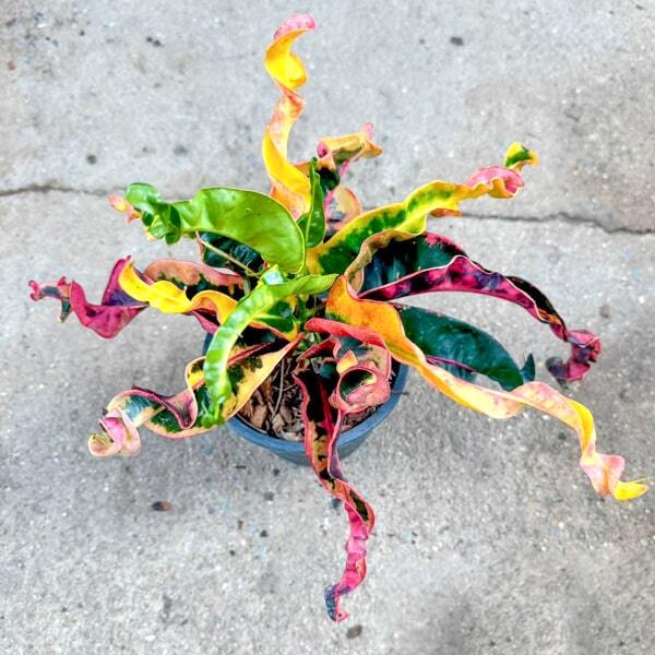Окрас кротонов зависит от сезона. Даже яркие сорта могут приехать с зелеными листьями. По мере роста при достаточном количестве тепла и света при смене сезона они окрашиваются в сортовые цвета.