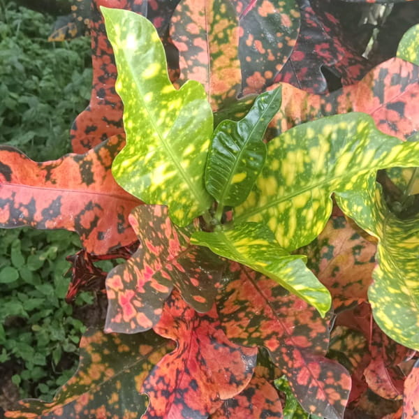 Окрас кротонов зависит от сезона. Даже яркие сорта могут приехать с зелеными листьями. По мере роста при достаточном количестве тепла и света при смене сезона они окрашиваются в сортовые цвета.