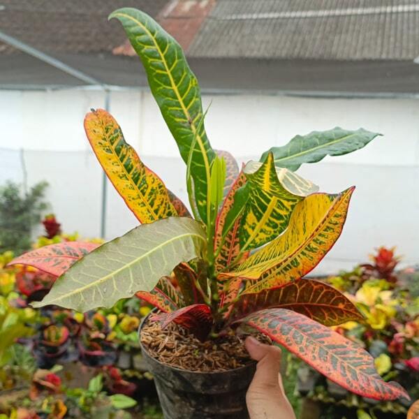 Окрас кротонов зависит от сезона. Даже яркие сорта могут приехать с зелеными листьями. По мере роста при достаточном количестве тепла и света при смене сезона они окрашиваются в сортовые цвета.