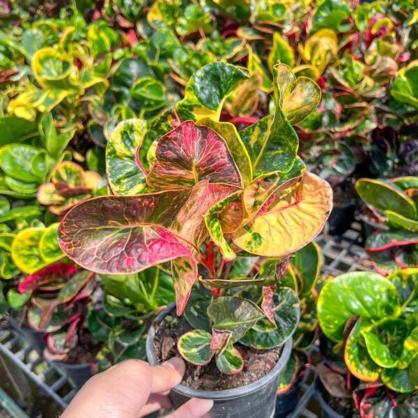 Окрас кротонов зависит от сезона. Даже яркие сорта могут приехать с зелеными листьями. По мере роста при достаточном количестве тепла и света при смене сезона они окрашиваются в сортовые цвета.