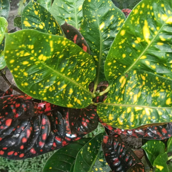 Окрас кротонов зависит от сезона. Даже яркие сорта могут приехать с зелеными листьями. По мере роста при достаточном количестве тепла и света при смене сезона они окрашиваются в сортовые цвета.