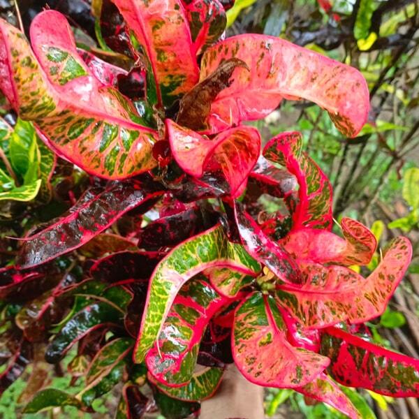 Окрас кротонов зависит от сезона. Даже яркие сорта могут приехать с зелеными листьями. По мере роста при достаточном количестве тепла и света при смене сезона они окрашиваются в сортовые цвета.