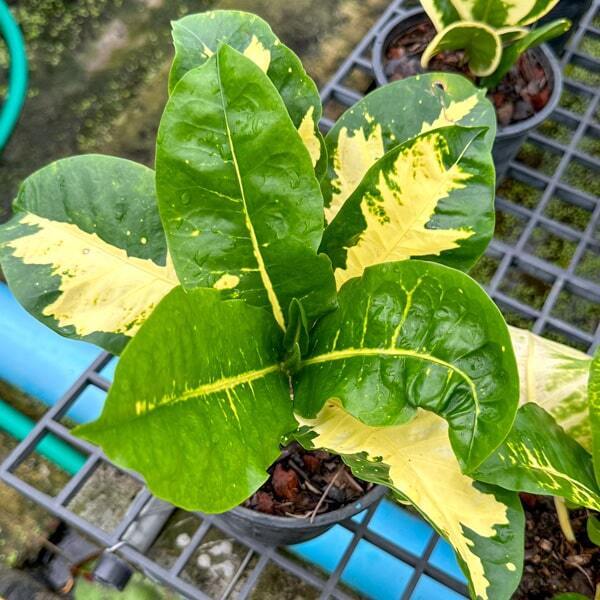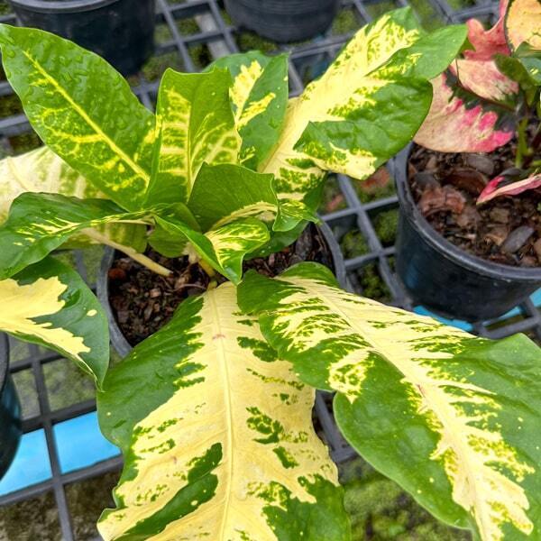 Окрас кротонов зависит от сезона. Даже яркие сорта могут приехать с зелеными листьями. По мере роста при достаточном количестве тепла и света при смене сезона они окрашиваются в сортовые цвета.