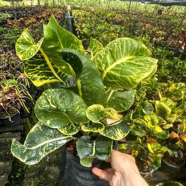 Окрас кротонов зависит от сезона. Даже яркие сорта могут приехать с зелеными листьями. По мере роста при достаточном количестве тепла и света при смене сезона они окрашиваются в сортовые цвета.