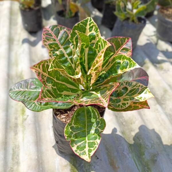 Окрас кротонов зависит от сезона. Даже яркие сорта могут приехать с зелеными листьями. По мере роста при достаточном количестве тепла и света при смене сезона они окрашиваются в сортовые цвета.