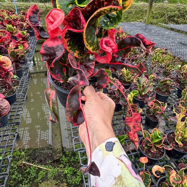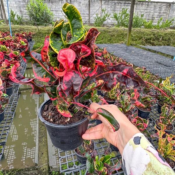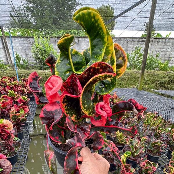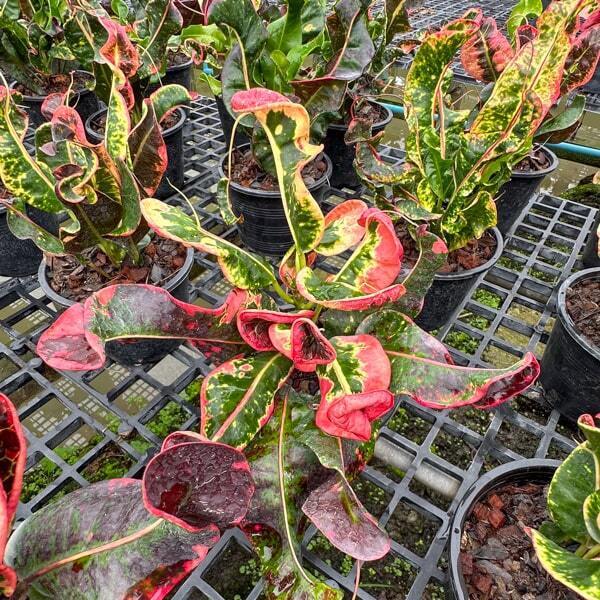 Окрас кротонов зависит от сезона. Даже яркие сорта могут приехать с зелеными листьями. По мере роста при достаточном количестве тепла и света при смене сезона они окрашиваются в сортовые цвета.