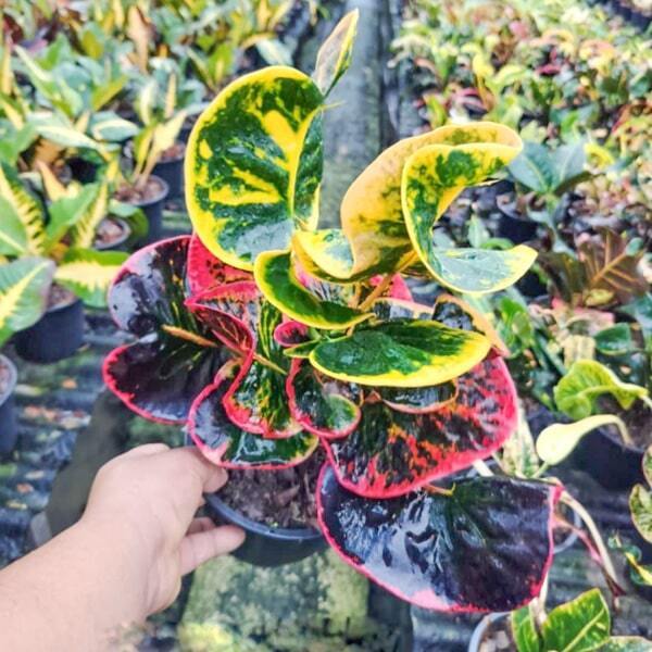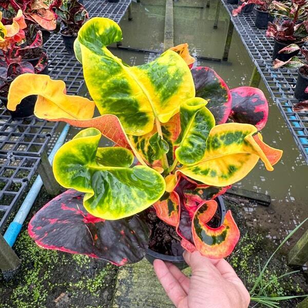 Окрас кротонов зависит от сезона. Даже яркие сорта могут приехать с зелеными листьями. По мере роста при достаточном количестве тепла и света при смене сезона они окрашиваются в сортовые цвета.