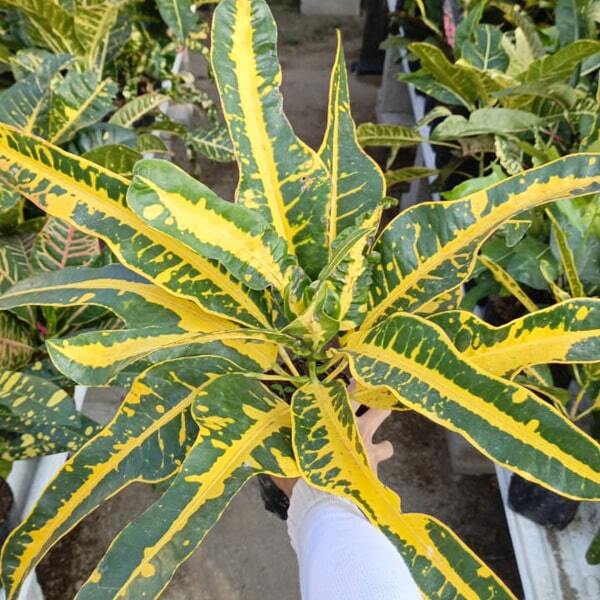 Окрас кротонов зависит от сезона. Даже яркие сорта могут приехать с зелеными листьями. По мере роста при достаточном количестве тепла и света при смене сезона они окрашиваются в сортовые цвета.