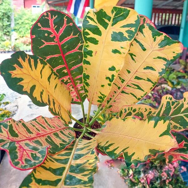 Окрас кротонов зависит от сезона. Даже яркие сорта могут приехать с зелеными листьями. По мере роста при достаточном количестве тепла и света при смене сезона они окрашиваются в сортовые цвета.
