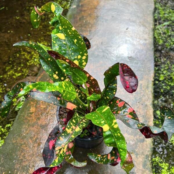 Окрас кротонов зависит от сезона. Даже яркие сорта могут приехать с зелеными листьями. По мере роста при достаточном количестве тепла и света при смене сезона они окрашиваются в сортовые цвета.