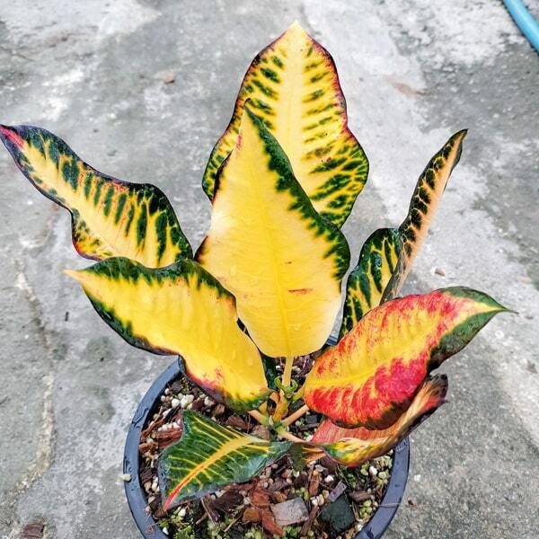 Окрас кротонов зависит от сезона. Даже яркие сорта могут приехать с зелеными листьями. По мере роста при достаточном количестве тепла и света при смене сезона они окрашиваются в сортовые цвета.