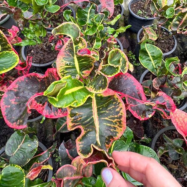 Окрас кротонов зависит от сезона. Даже яркие сорта могут приехать с зелеными листьями. По мере роста при достаточном количестве тепла и света при смене сезона они окрашиваются в сортовые цвета.