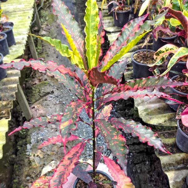 Окрас кротонов зависит от сезона. Даже яркие сорта могут приехать с зелеными листьями. По мере роста при достаточном количестве тепла и света при смене сезона они окрашиваются в сортовые цвета.