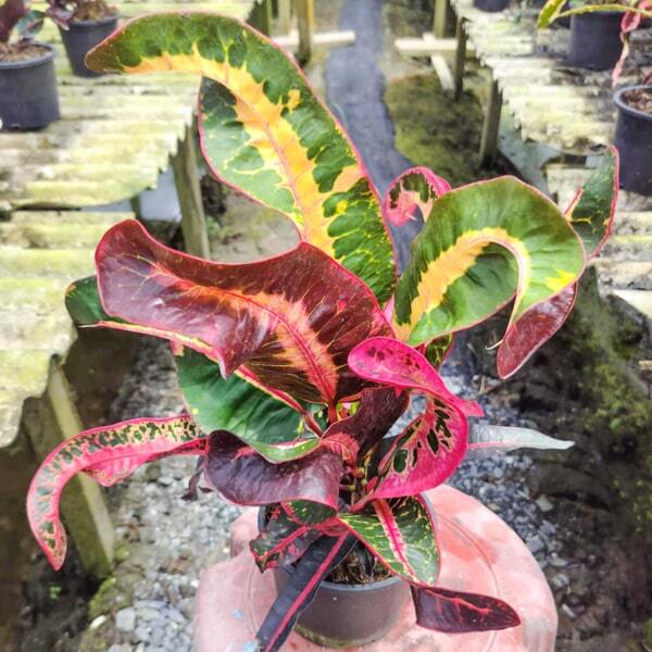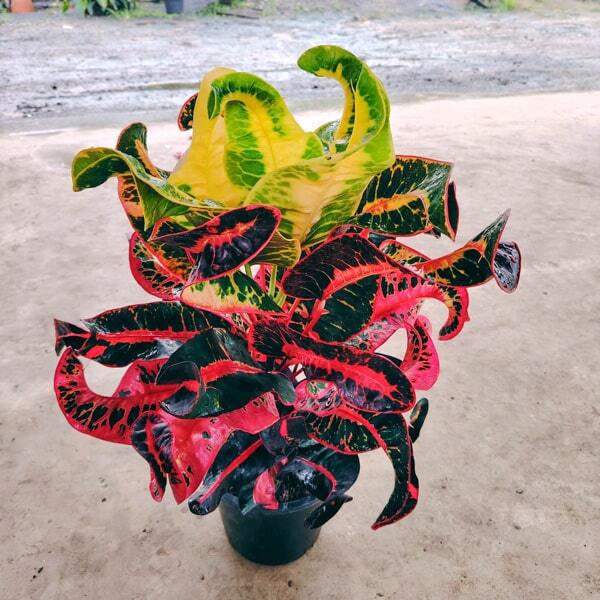 Окрас кротонов зависит от сезона. Даже яркие сорта могут приехать с зелеными листьями. По мере роста при достаточном количестве тепла и света при смене сезона они окрашиваются в сортовые цвета.