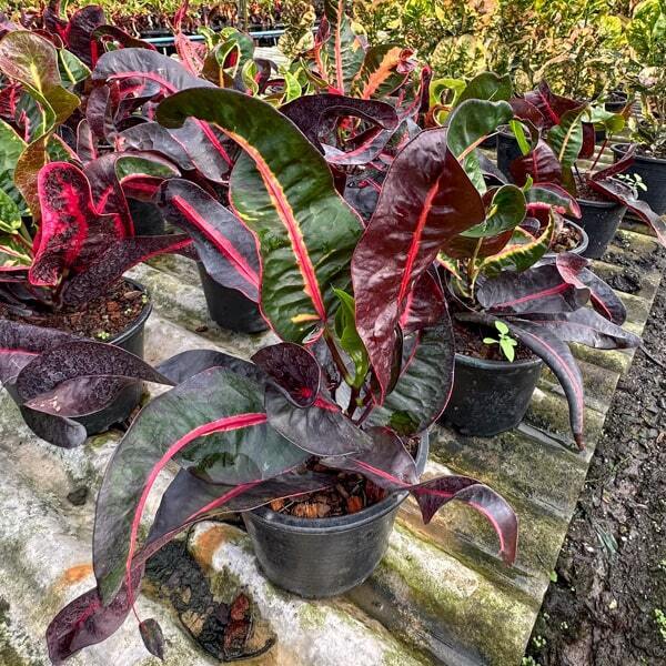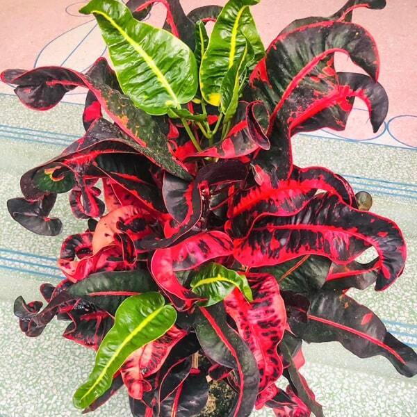 Окрас кротонов зависит от сезона. Даже яркие сорта могут приехать с зелеными листьями. По мере роста при достаточном количестве тепла и света при смене сезона они окрашиваются в сортовые цвета.